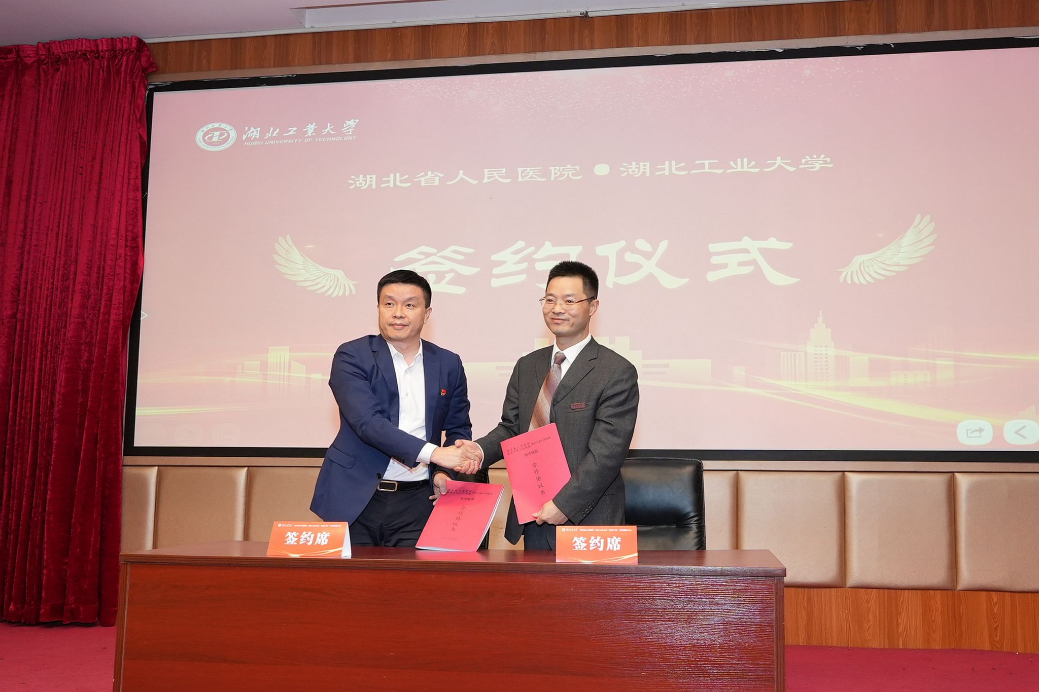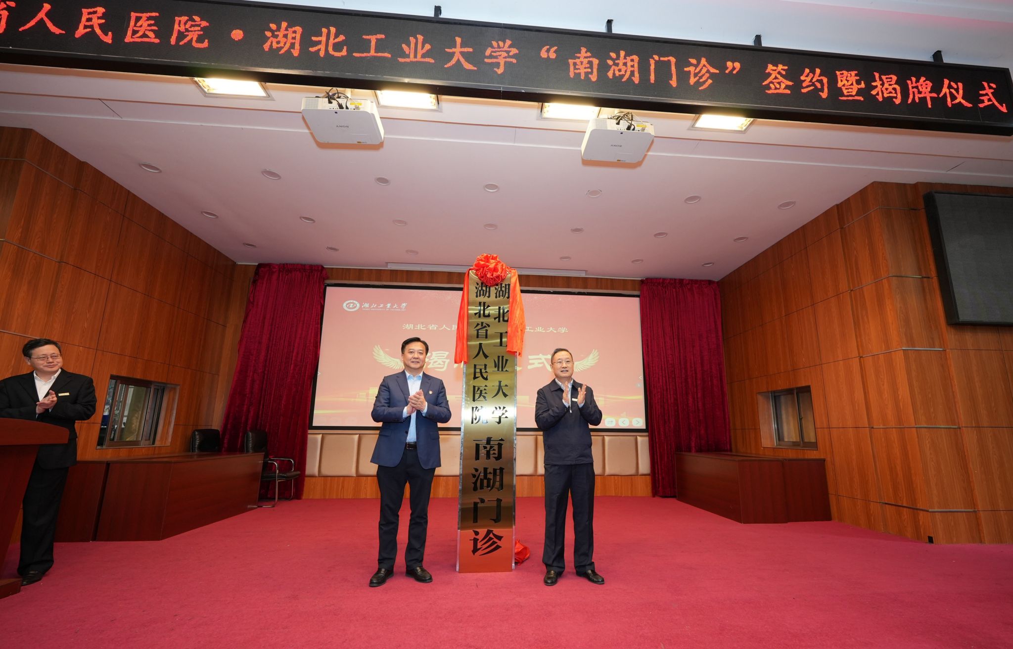 现场,湖北工业大学医院党总支书记任卫华与湖北省人民医院党委常委、副院长耿庆教授共同签署《合作协议》,湖北工业大学党委书记彭育园与省人民医院党委书记万红慧共同为“南湖门诊”揭牌。