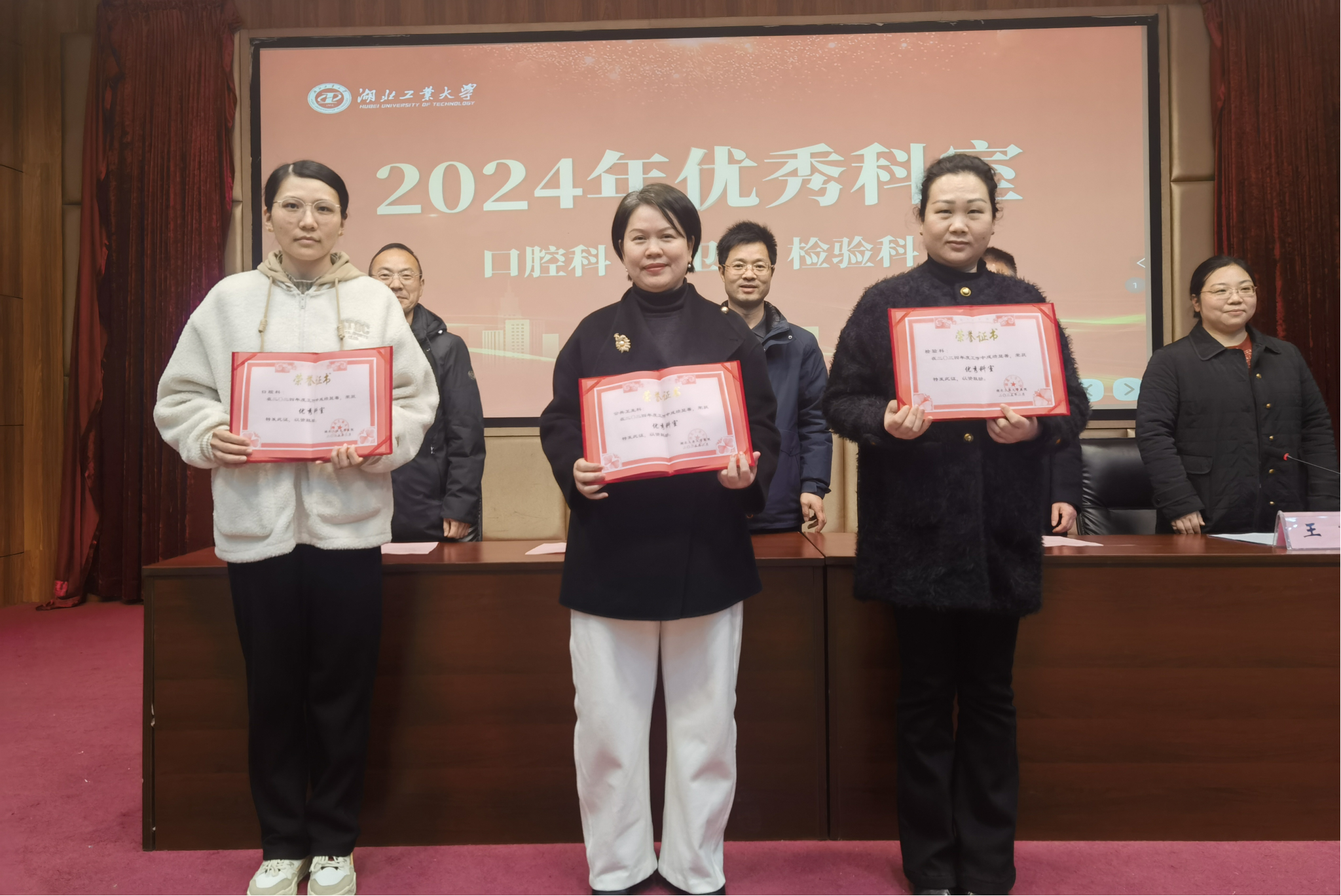 总结过去,大会报告了2024年校医院取得的成绩和硕果,医院领导班子共同为公卫科、口腔科、检验科三个优秀科室进行表彰。