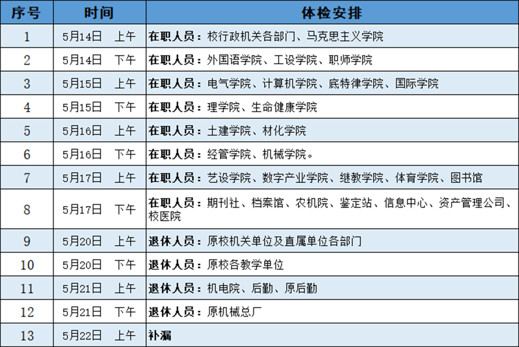 一、体检时间:5月14日-21日工作日全天(上午8:30-12:00;下午14:00-17:00),22日上午为补检。