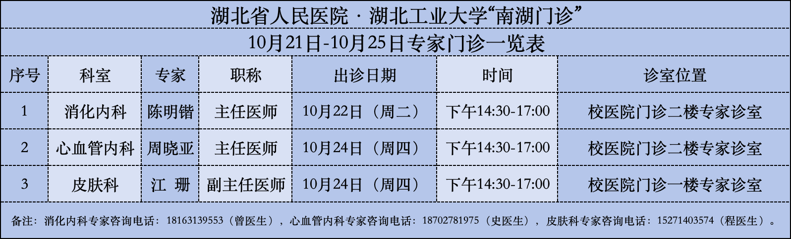 校医院将邀请湖北省人民医院知名专家——消化内科陈明锴主任、心血管内科周晓亚主任、皮肤科江珊主任两位专家教授前来校医院坐诊(具体坐诊信息见下),请广大师生、周边居民持续关注南湖门诊专家坐诊信息,如有